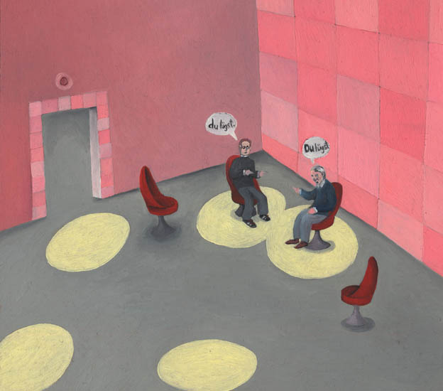 ich und Roland Barthes diskutieren über den Tod des Malers // me and Barthes discussing about the death of the painter , Öl auf Holz, 2006